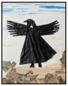 „Abgehoben“ wird hier zum Sinnbild eines Klerus, der den Kontakt zum Boden verloren hat. Die Krähe schwebt nicht aus Leichtigkeit, sondern getrennt von der Wirklichkeit, getragen von Geld statt von echtem Glauben. Der Talar, einst Zeichen von Demut, wirkt wie ein Mantel der Abschottung. Unter ihr liegt der Boden nicht mehr fest, sondern zerfällt in Scheine.